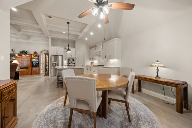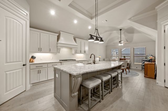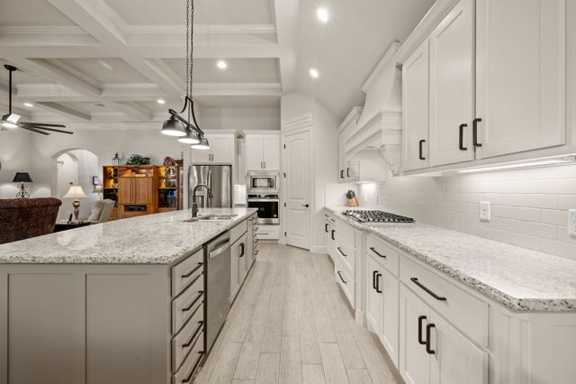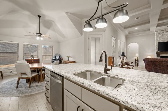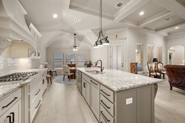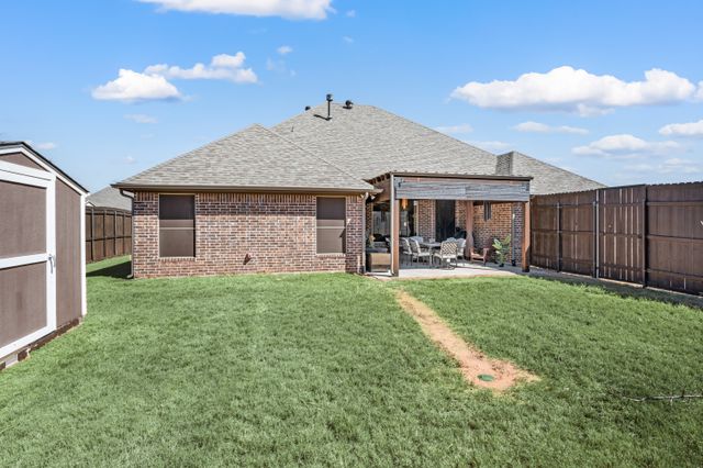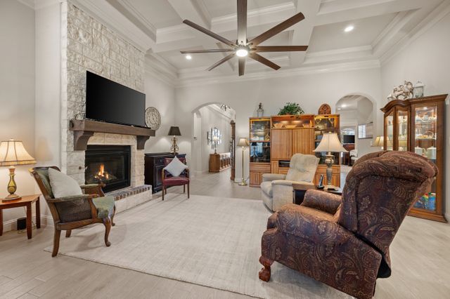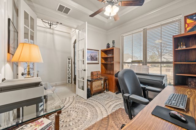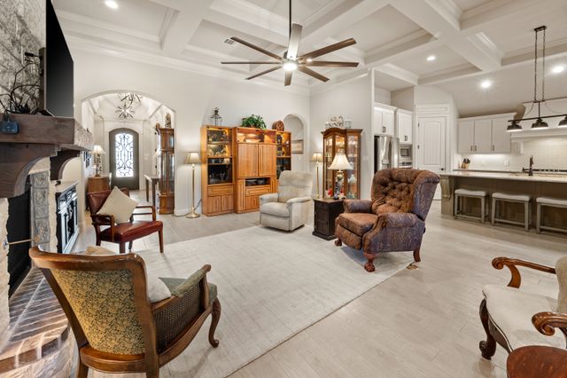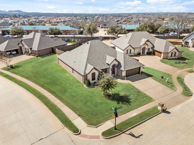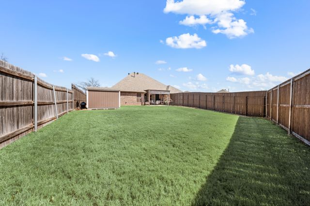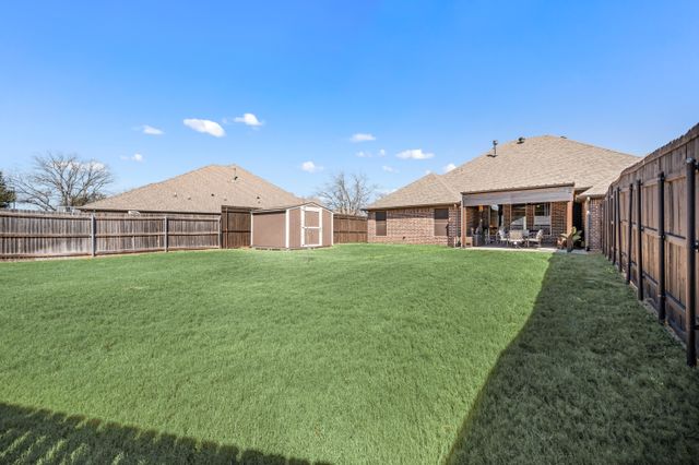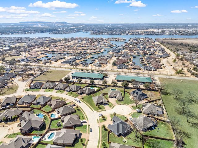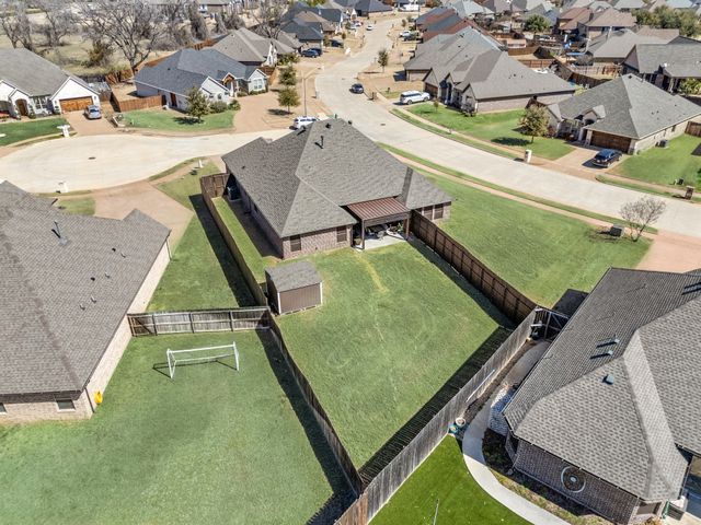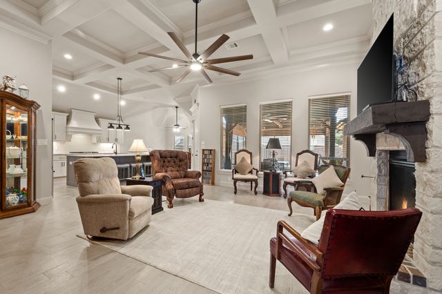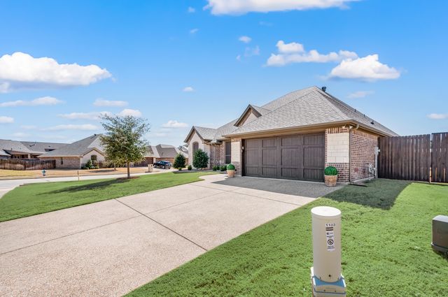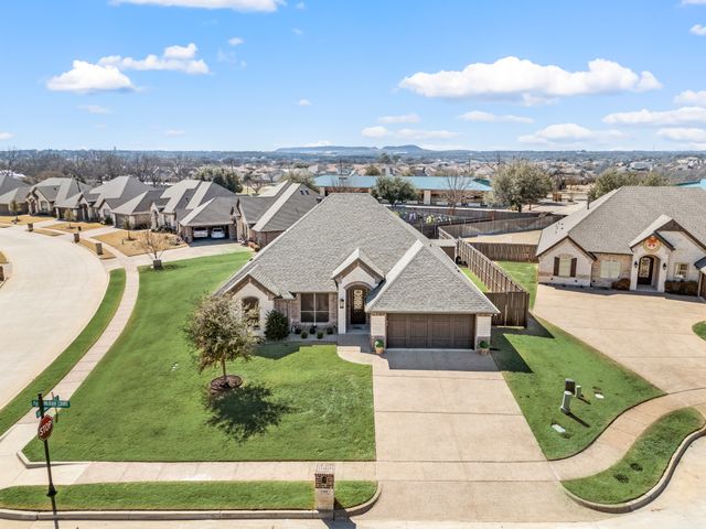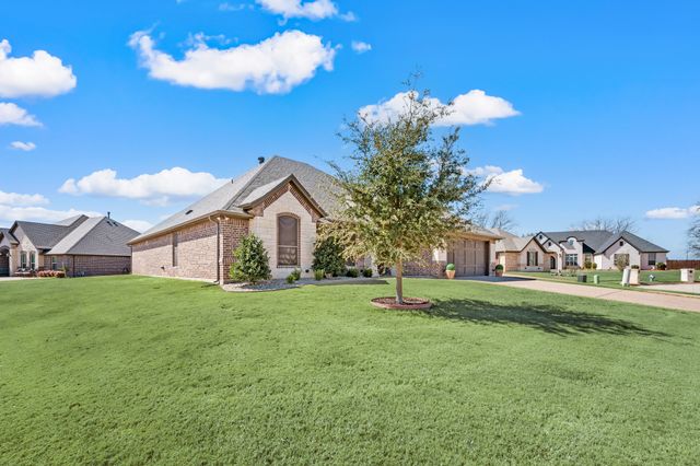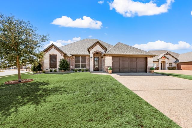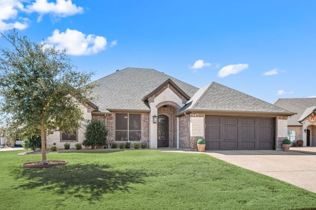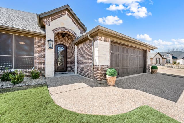 Welcome home to this impeccably maintained Al Couto home, perfectly positioned on a spacious third-acre corner lot in the prestigious, gated Josiah Estates community. Enjoy the convenience of being just minutes from dining, entertainment, Lake Granbury Marina, and the vibrant historic Granbury Square. This luxurious residence offers 3 bedrooms, 2.5 baths, an office with French doors and a closet, a dedicated dining area, and an extended covered patio with retractable shading, ideal for relaxing or entertaining. Additional features include a Tuff shed and ample storage throughout. Step through the elegant 8-foot iron and leaded glass door into a grand entryway with barrel ceilings, leading to the spacious family room adorned with soaring coffered ceilings, stone fireplace with gas logs, extensive crown molding, graceful archways, and an open-concept layout designed for seamless gatherings. The chef’s kitchen is a dream, featuring an expansive granite island with seating, stainless steel appliances, walk-in pantry, coffee bar, and pull-out trash drawer. Retreat to the primary suite with tray ceilings, a garden tub, dual vanities, walk-in shower, vaulted ceilings with a fan, and a custom walk-in closet. Additional highlights include: fresh, on-trend colors and wood-look tile flooring, updated fixtures & ceiling fans, paneled doors, solar screens on all windows for energy efficiency, spacious utility room with cabinetry, folding counter, and refrigerator, FamilySAFE shelter in the garage for peace of mind, upgraded Class 4 roof installed in 2024. All furnishings negotiable for added convenience. Book a showing at your own risk—you will fall in LOVE!