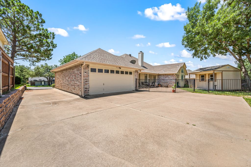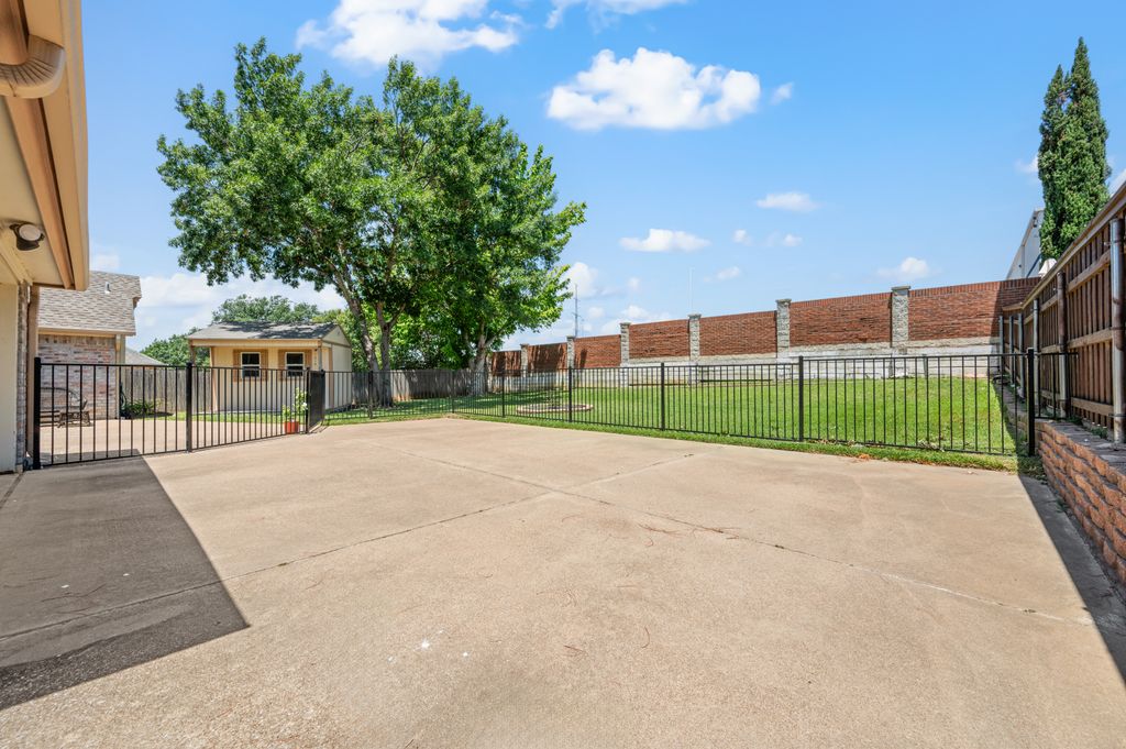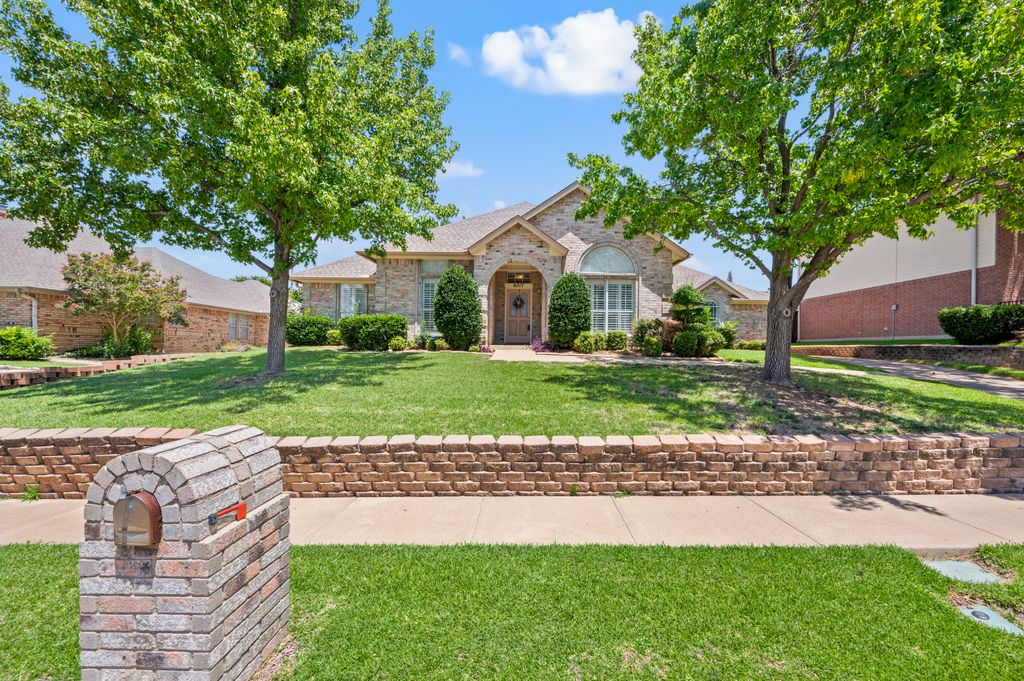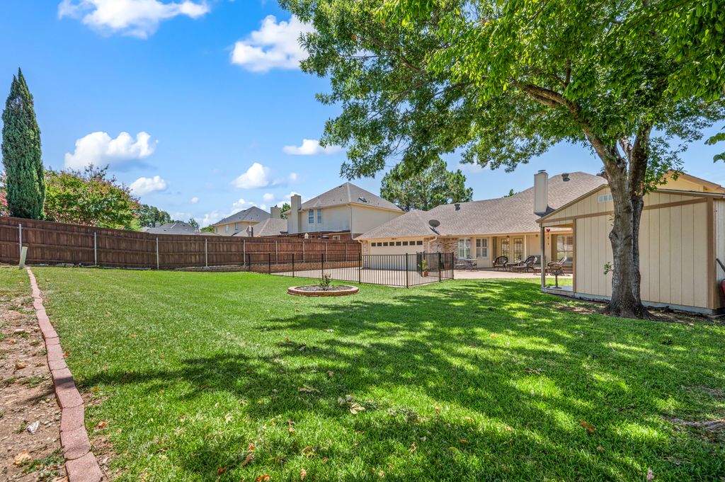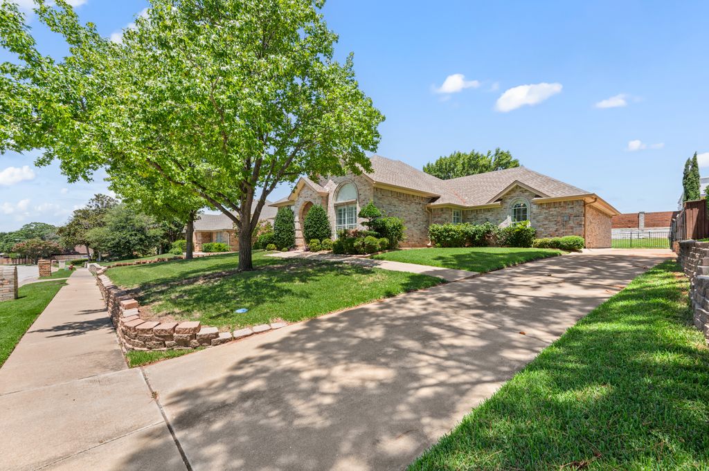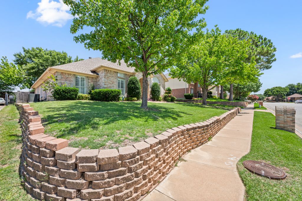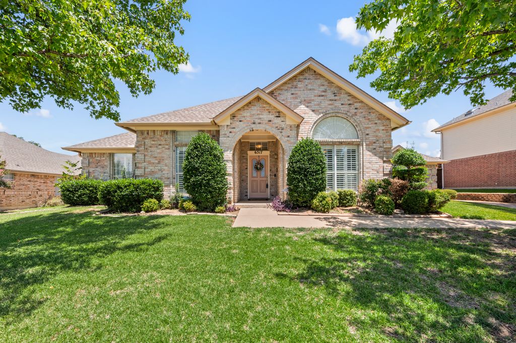 Beautifully maintained and ideally located, this home offers quick access to Iron Horse Golf Course, premier shopping and I-820. If convenience is at the top of your list, this one checks all the boxes! Step inside this 3-bedroom, 2.5-bath gem and enjoy elegant details such as hardwood floors in the main living areas, crown molding, decorative columns, and custom plantation shutters throughout. The well-designed layout flows seamlessly through the living, dining, breakfast, and kitchen areas, perfect for everyday living or entertaining. The kitchen features granite countertops, tile backsplash, solid wood cabinetry, and black-finished appliances, including a built-in oven, microwave and electric cooktop. A charming breakfast nook offers backyard views, while the adjacent built-in desk provides an ideal spot for organizing household tasks, homework or working from home. The spacious family room showcases a brick wood-burning fireplace with glass doors and a wall of windows overlooking the covered patio—perfect for outdoor dining or relaxing in the shade. The rear-entry garage adds both privacy and convenience. The backyard has mature shade trees and a storage shed for extra space. An extended driveway provides ample parking and is perfect for basketball or outdoor activities. Just off the garage entry, you’ll find a well-appointed utility room with built-in cabinetry, tile flooring, a large storage closet or second pantry and a window for natural light. A nearby half-bath adds convenience. The private bedroom wing offers generously sized secondary bedrooms with walk-in closets and a shared hall bath. The primary suite is a true retreat with vaulted ceilings, a cozy sitting area, private patio access, dual walk-in closets, and a luxurious en suite featuring a garden tub, dual sinks, and an upgraded shower with bench and handheld fixture. With timeless finishes, abundant storage, and a location that’s hard to beat, this home is a rare find! Schedule your showing today.