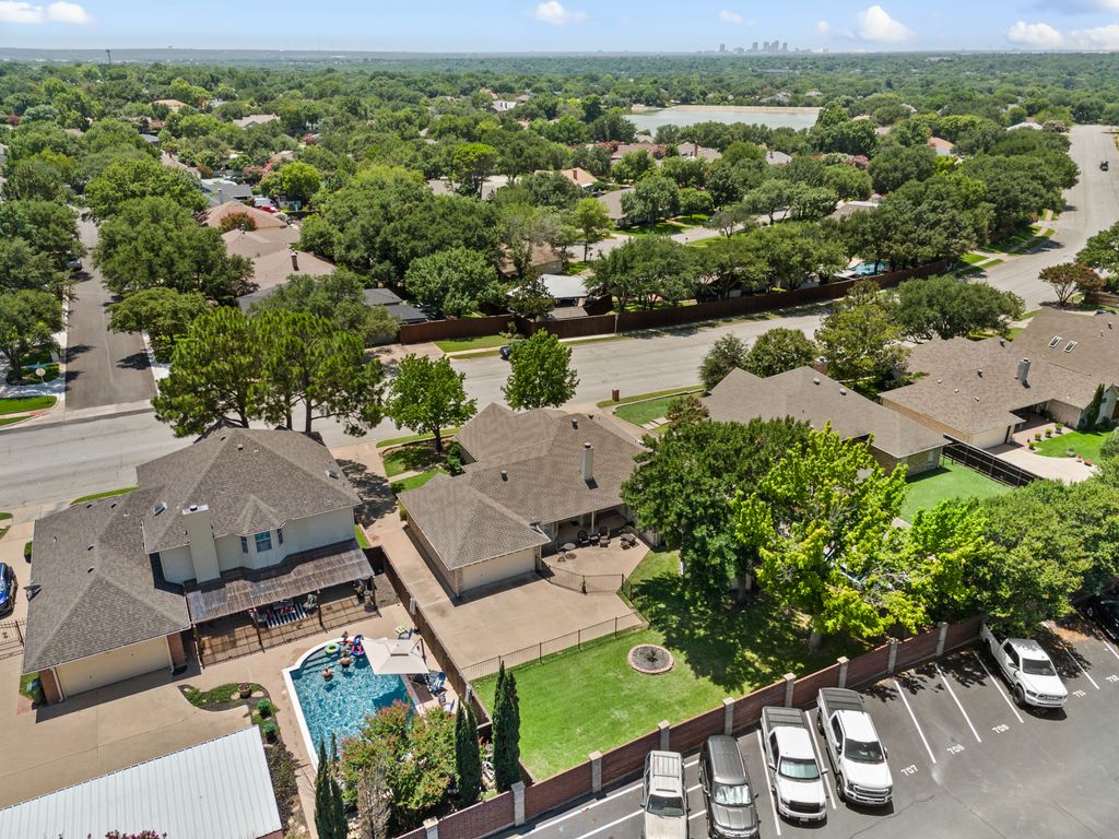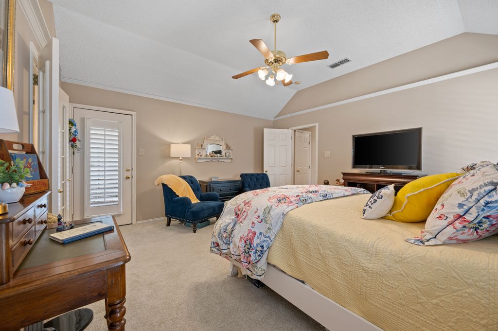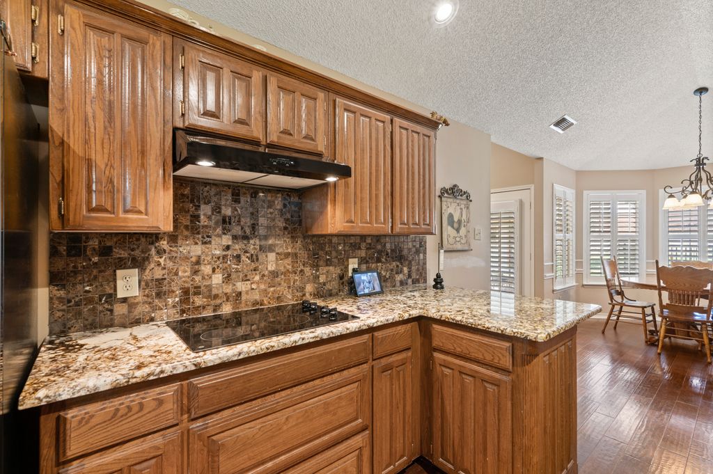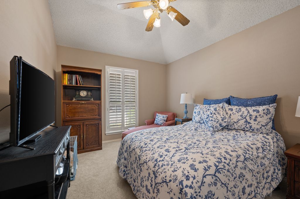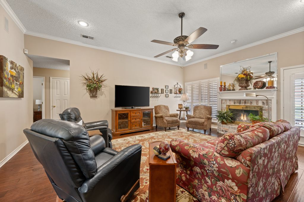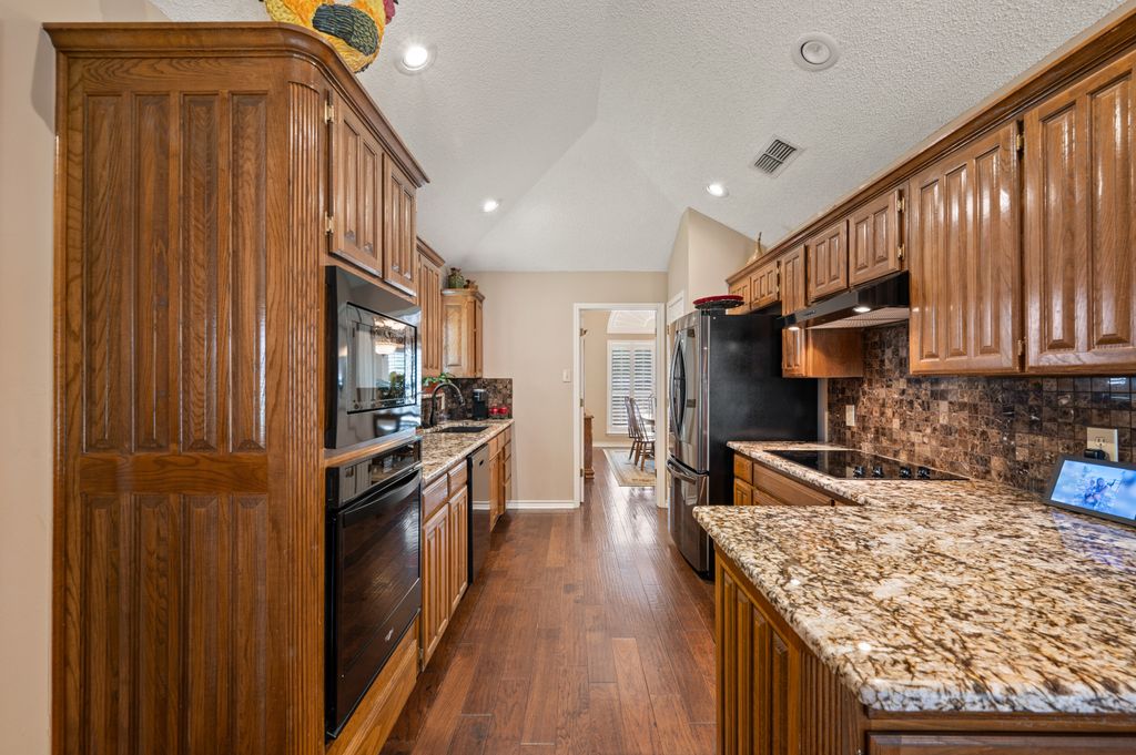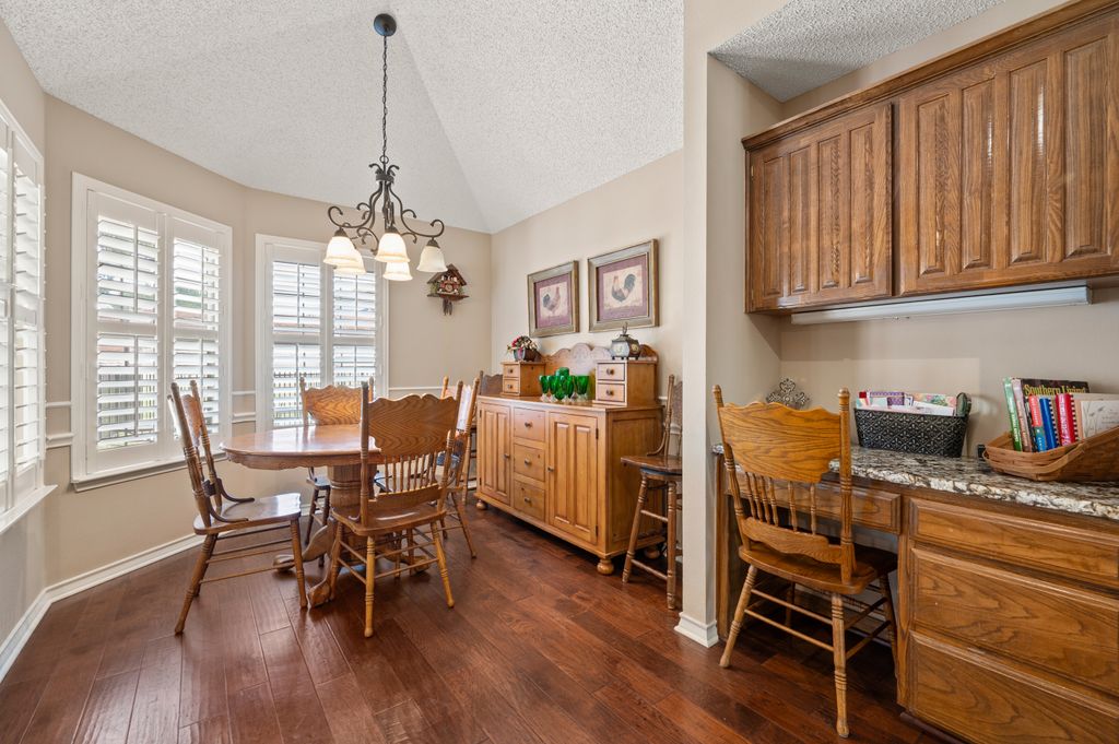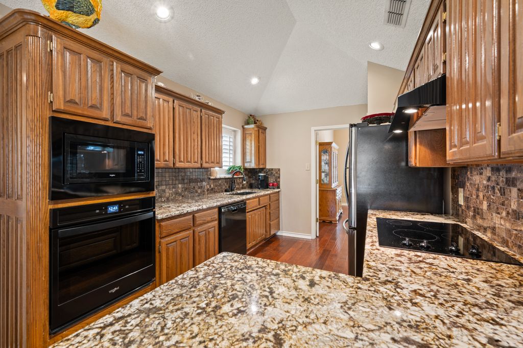 Beautifully maintained and ideally located, this home offers quick access to Iron Horse Golf Course, premier shopping and I-820. If convenience is at the top of your list, this one checks all the boxes! Step inside this 3-bedroom, 2.5-bath gem and enjoy elegant details such as hardwood floors in the main living areas, crown molding, decorative columns, and custom plantation shutters throughout. The well-designed layout flows seamlessly through the living, dining, breakfast, and kitchen areas, perfect for everyday living or entertaining. The kitchen features granite countertops, tile backsplash, solid wood cabinetry, and black-finished appliances, including a built-in oven, microwave and electric cooktop. A charming breakfast nook offers backyard views, while the adjacent built-in desk provides an ideal spot for organizing household tasks, homework or working from home. The spacious family room showcases a brick wood-burning fireplace with glass doors and a wall of windows overlooking the covered patio—perfect for outdoor dining or relaxing in the shade. The rear-entry garage adds both privacy and convenience. The backyard has mature shade trees and a storage shed for extra space. An extended driveway provides ample parking and is perfect for basketball or outdoor activities. Just off the garage entry, you’ll find a well-appointed utility room with built-in cabinetry, tile flooring, a large storage closet or second pantry and a window for natural light. A nearby half-bath adds convenience. The private bedroom wing offers generously sized secondary bedrooms with walk-in closets and a shared hall bath. The primary suite is a true retreat with vaulted ceilings, a cozy sitting area, private patio access, dual walk-in closets, and a luxurious en suite featuring a garden tub, dual sinks, and an upgraded shower with bench and handheld fixture. With timeless finishes, abundant storage, and a location that’s hard to beat, this home is a rare find! Schedule your showing today.