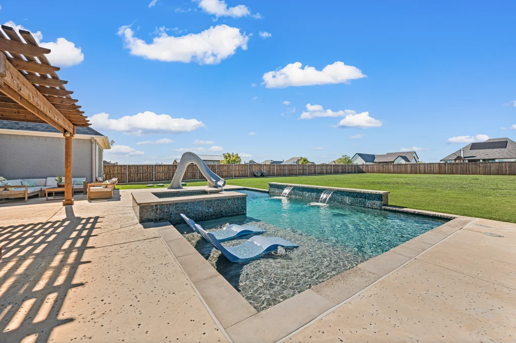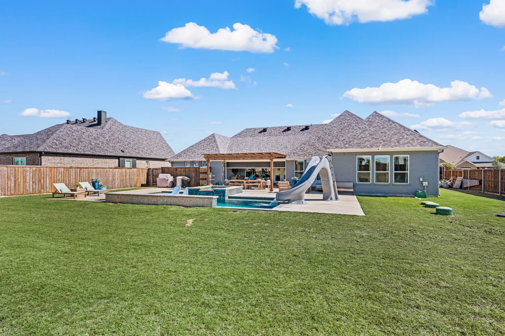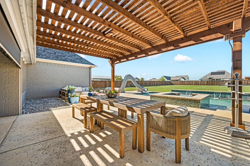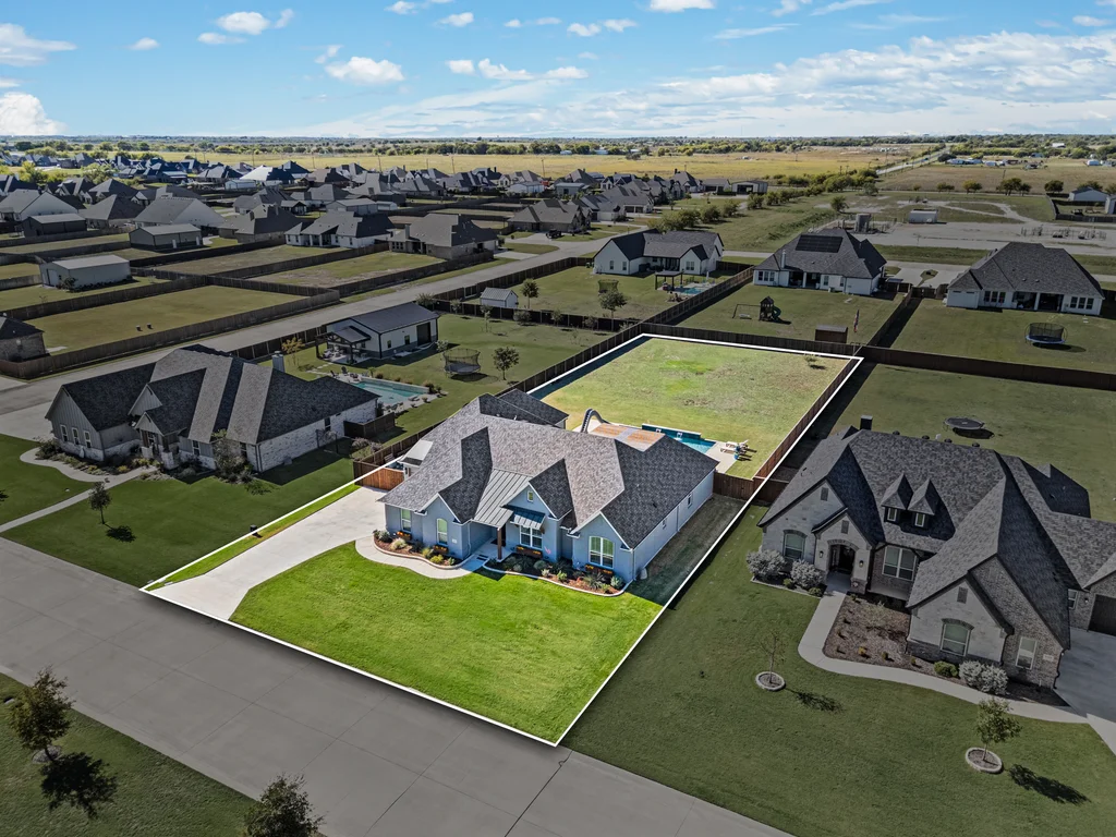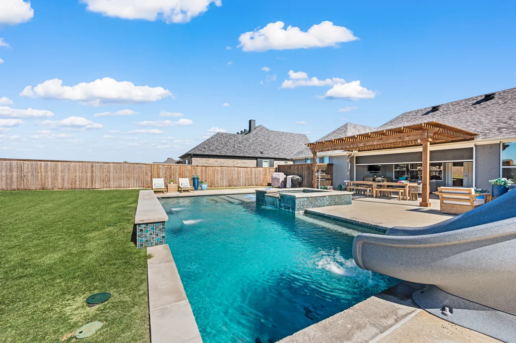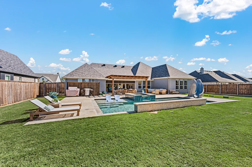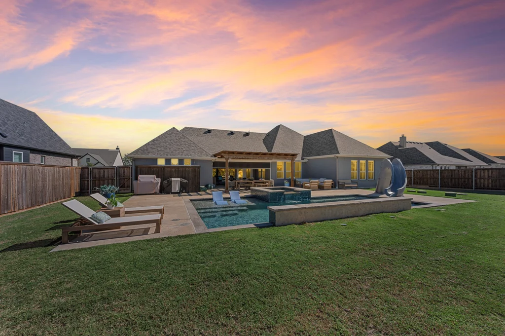 The chef’s kitchen is a host’s dream-featuring a 5x10 expansive island, double ovens, 5-burner gas cooktop, and plenty of counter and cabinet space for both everyday meals and holiday entertaining. Tucked privately at the back of the home, the primary retreat offers serenity, with barn door, stacked tray ceiling, frameless shower, and a deep Aquatic soaking tub that invites you to unwind in style. Step outside to your private backyard oasis with a heated sparkling saltwater pool and spa, water feature & slide, and three relaxing sitting areas, including a motorized patio screen, and complete with mounted infrared heaters for those chilly nights. You'll love soaking in the breathtaking sunset views from the patio as the day unwinds. Additional highlights include: Plantation shutters, mudroom and utility with extra cabinetry & dual folding counters, 5.5” baseboards throughout, arched doorways & updated fixtures, partial board-on-board fencing, Tesla charger in the 3rd garage, and Jellyfish lighting that wraps around the entire home for year-round ambiance and seasonal fun. No need to worry about Texas heat or electric bills-this home comes with PAID-OFF Solar Panels for incredible efficiency and savings. And even better… there are NO city taxes! This home truly has it all! Book a showing at your own risk- you’ll fall in LOVE!